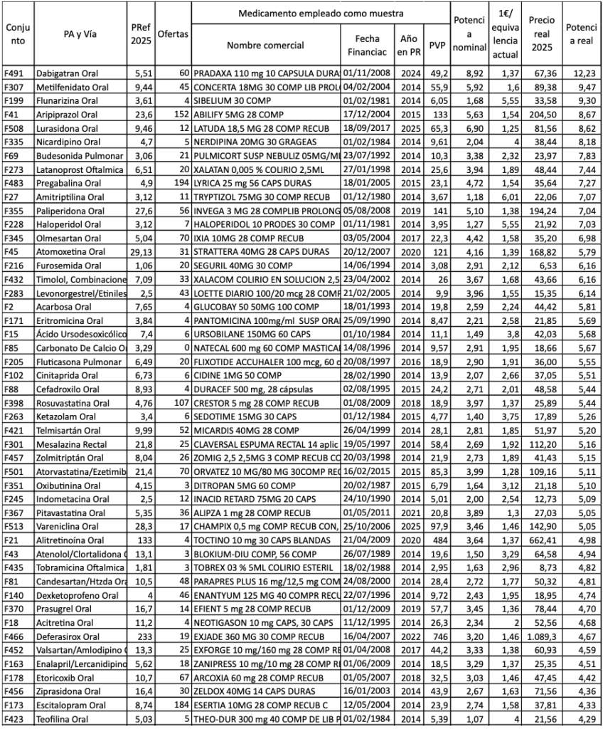 De la misma manera que con simvastatina, podemos conocer, de todos los medicamentos sometidos a PR, su sobreprecio nominal y su sobreprecio real, es decir cuantas veces más alto que su PR actual era el precio que tenían antes de entrar al SPR. Con ello también sabemos la potencia nominal y potencia real que han tenido sus bajadas de precio, que se muestran en las figuras 20 y 21, así como el recorrido de bajada de precio que aún podrían tener. Para su obtención he seleccionado, de cada Conjunto de referencia activo en 2025, la presentación del medicamento con patente que ha tenido la mayor bajada en el PR (en %) y con cada uno he obtenido su sobreprecio nominal y real y la potencia nominal y real de su bajada de precio.
