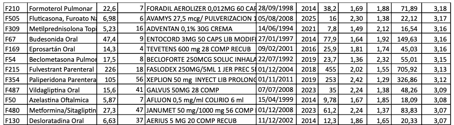 Porque cuando el SPR desinfla esa ingente bolsa de beneficios, el dominio de los genéricos es aplastante y las marcas dueñas de las patentes huyen y desaparecen del mercado. Pero cuando la bolsa de beneficios se mantiene casi intacta, la penetración de los genéricos se produce con cuentagotas, como muestra la Tabla 9 con los 4 PA anteriores.