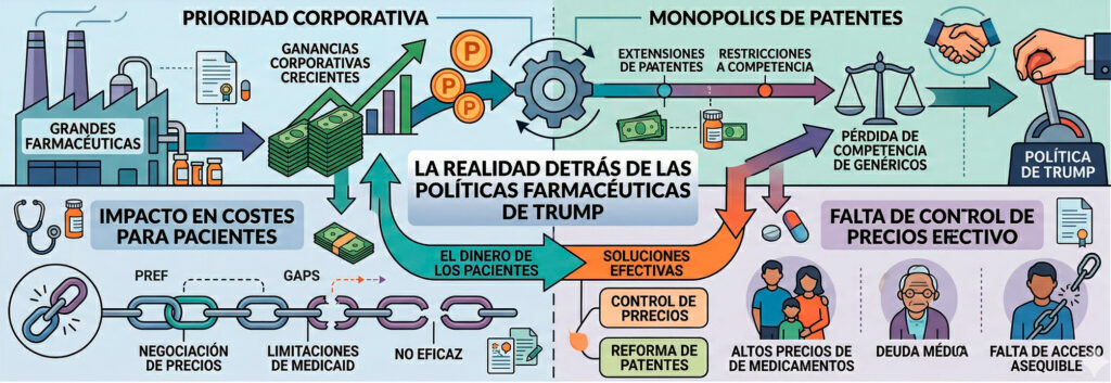Mientras Trump promete abaratar los precios de los medicamentos, va tomando decisiones que van en contra de la salud de muchos estadounidenses: firma ordenes ejecutivas y leyes que eximen de la negociación de precios a productos que estaban previamente cubiertos beneficiando así a la industria farmacéutica, y elimina los subsidios a los seguros médicos que facilitaban en acceso a los medicamentos.