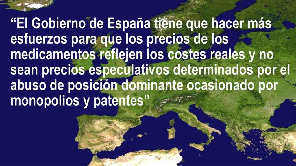 El Gobierno de España tiene que hacer más esfuerzos para que los precios de los medicamentos reflejen los costes reales y no sean precios especulativos determinados por el abuso de posición dominante ocasionado por monopolios y patentes.