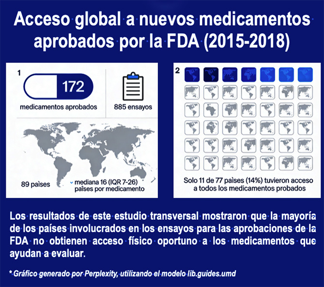 Hallazgos En este estudio transversal de 172 medicamentos aprobados por la FDA de 2015 a 2018 y probados en 89 países, el 24 % fueron físicamente accesibles en todos los países donde se probaron 5 años después de la aprobación de la FDA. Los países de Europa Occidental tenían un acceso notablemente mejor (82%) que los países de África (28%), sin mejoras a lo largo del tiempo para los países de bajos y medianos ingresos.