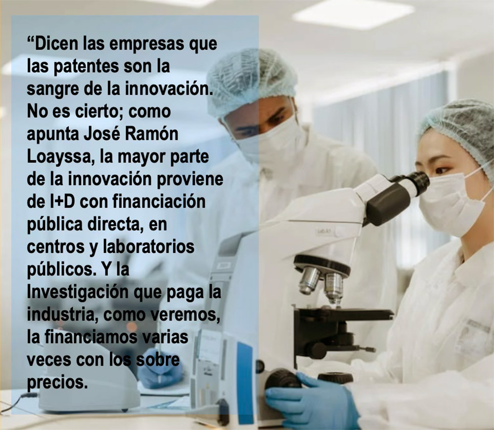 Dicen las empresas que las patentes son la sangre de la innovación. No es cierto; como apunta José Ramón Loayssa, la mayor parte de la innovación proviene de I+D con financiación pública directa, en centros y laboratorios públicos. Y la Investigación que paga la industria, como veremos, la financiamos varias veces con los sobre precios.